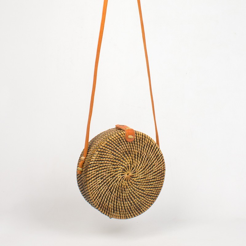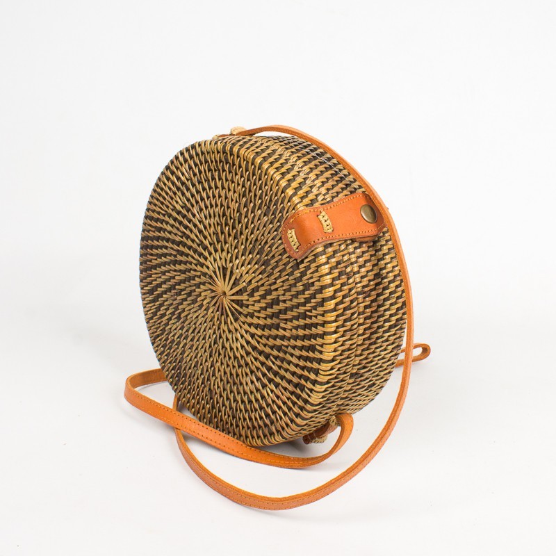 Ce petit Sac en rotin, (rotin fumés à la fibre de coco pour renforcer sa solidité) est tissé à la main.