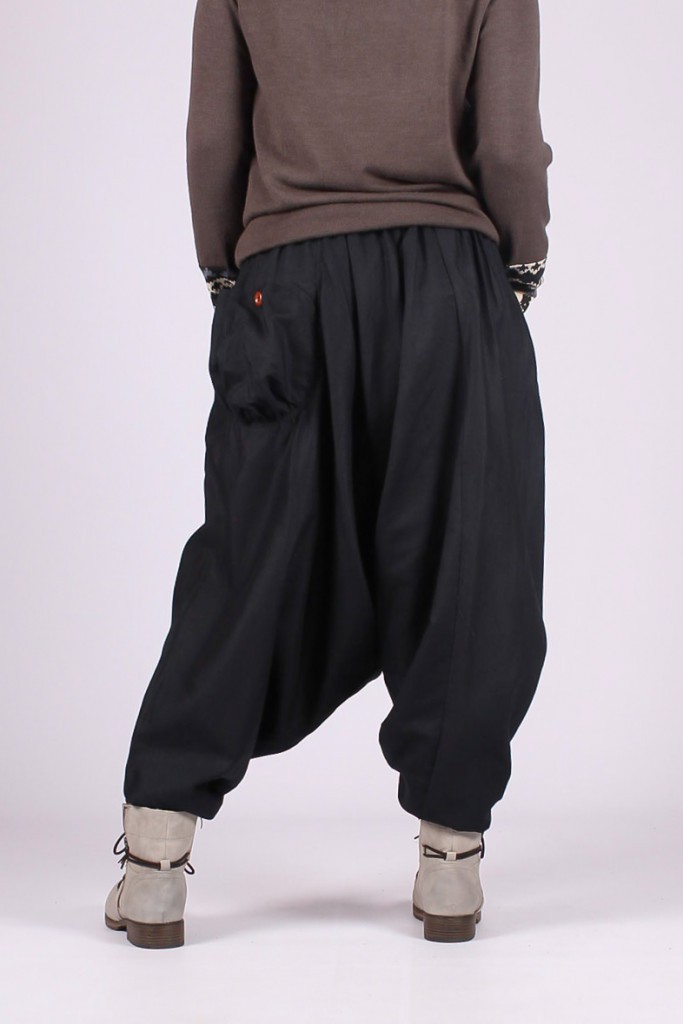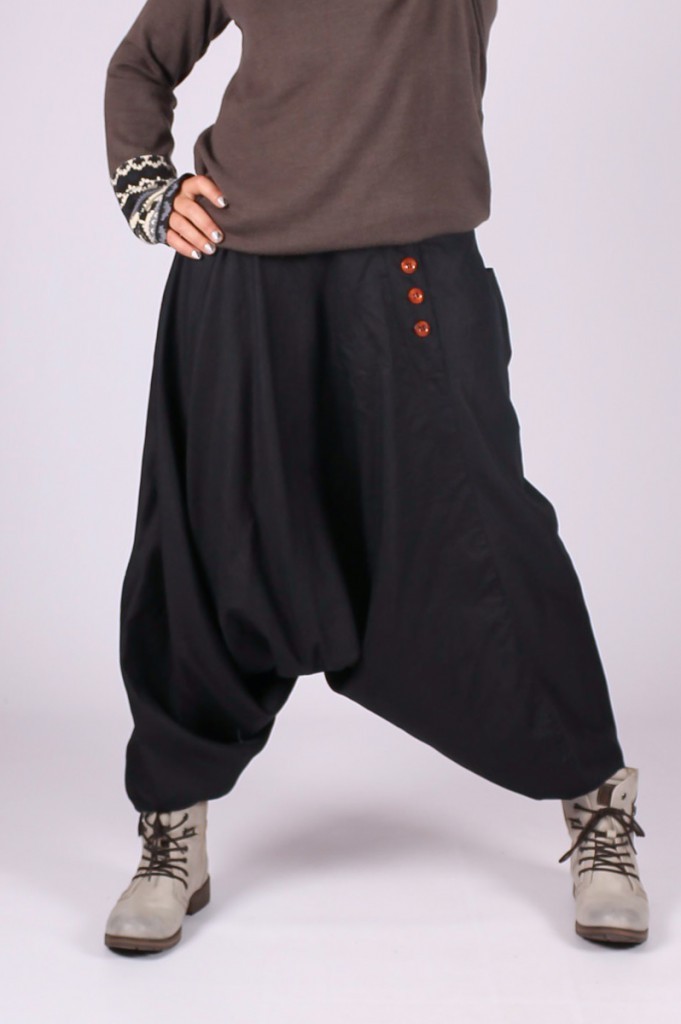 Sarouel à entrejambe basse (50 cm) avec 2 poches et boutons à l'avant, ceinture élastiquée à l'arrière. Coutures apparentes. Coupe droite pour le bas des jambes. Longueur : 100 cm. Coupe classique, effet habillé, à porter plutôt taille basse, avec un chemisier cintré et des bottines pour un look très chic