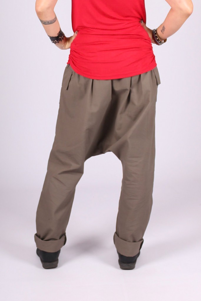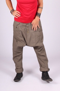 Sarouel à entrejambe basse (50 cm) avec 2 poches et boutons à l'avant, ceinture élastiquée à l'arrière.