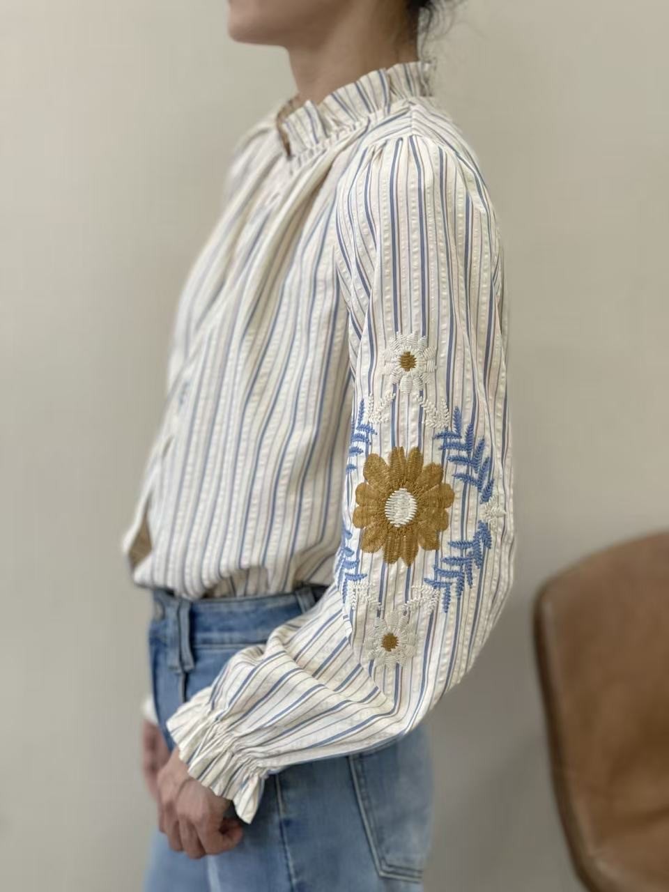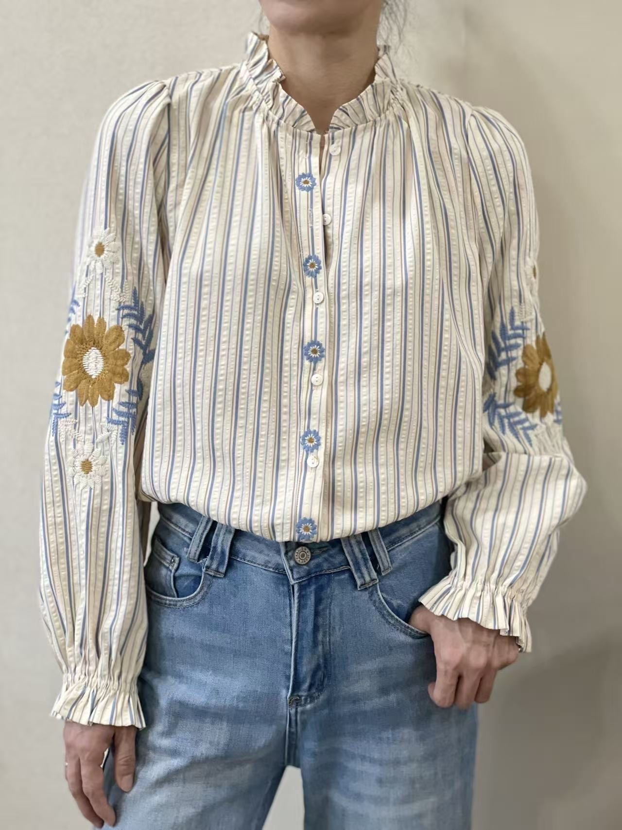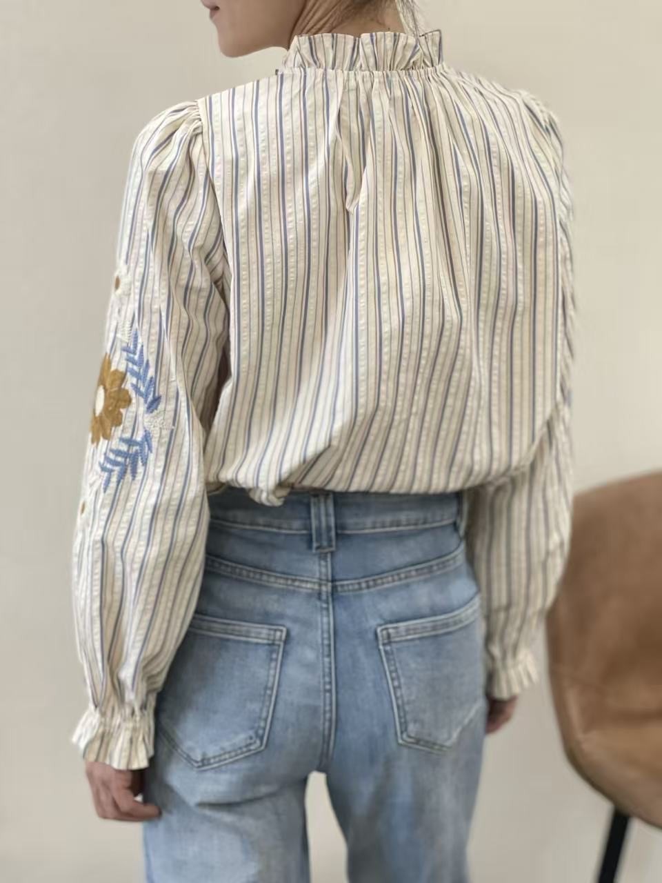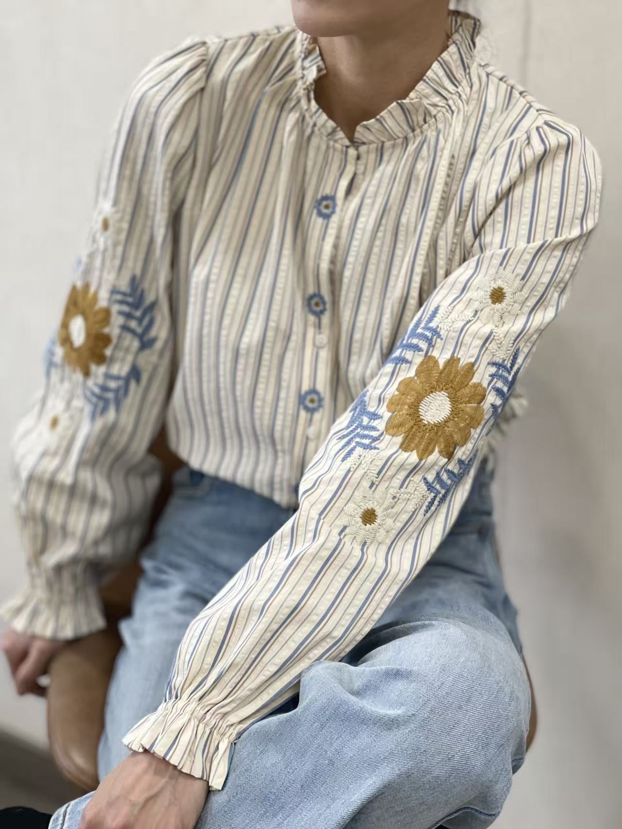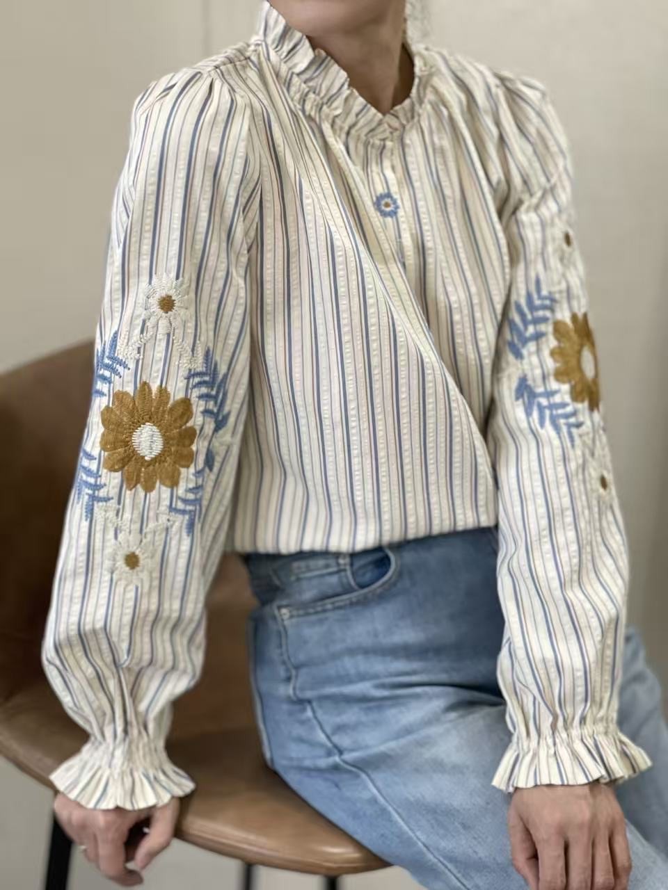 Chemisier col volanté, rayures bleu, fleurs brodées