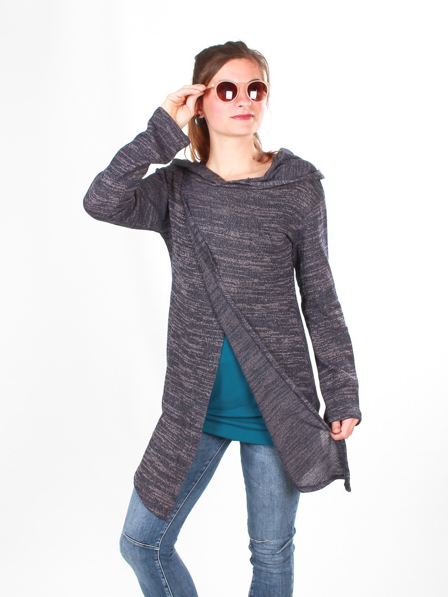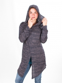 Pull, tunique très original par sa grande capuche drapée et son ouverture asymétrique croisée devant.