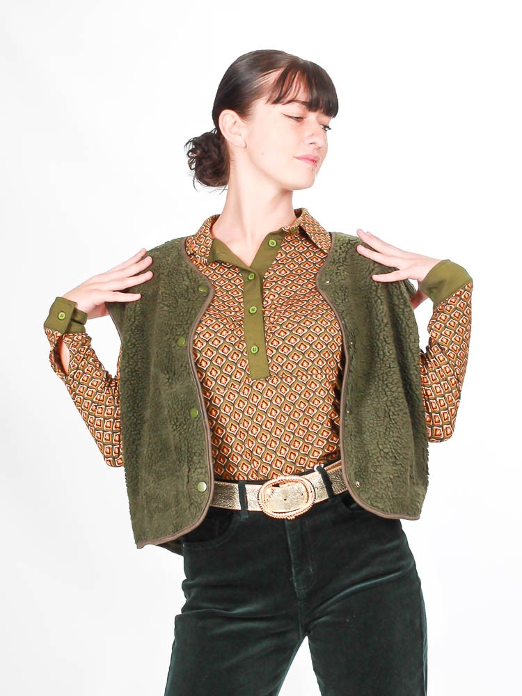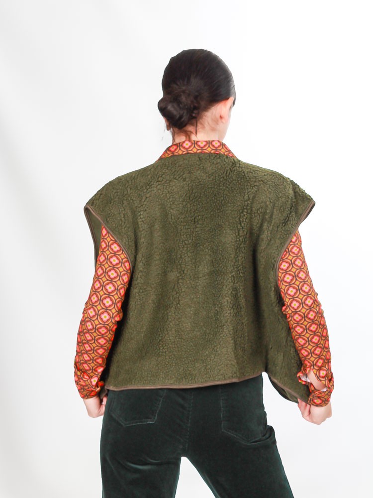 Gilet sans manches effet moutonné, léger et doublé. Fermeture pression pratique, poches latérales fonctionnelles, encolure V élégante. Parfait pour un look casual ou superposé !