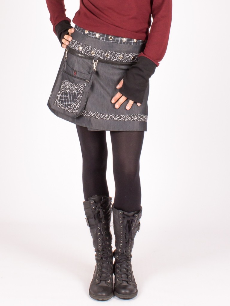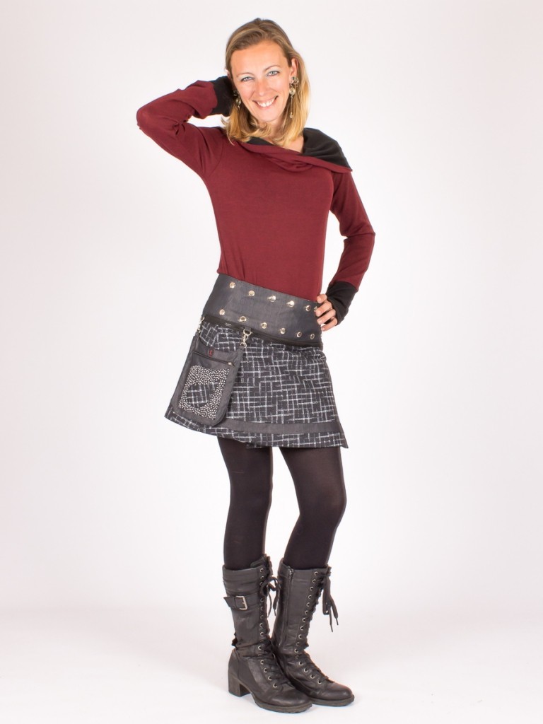 Réversible 4 fois, un zip contenu dans la ceinture permet d'en switcher le sens. Celui du pan de jupe aussi Elle peut être portée seule, en sur-jupe ou mini-jupe avec des collants chauds l'hiver !