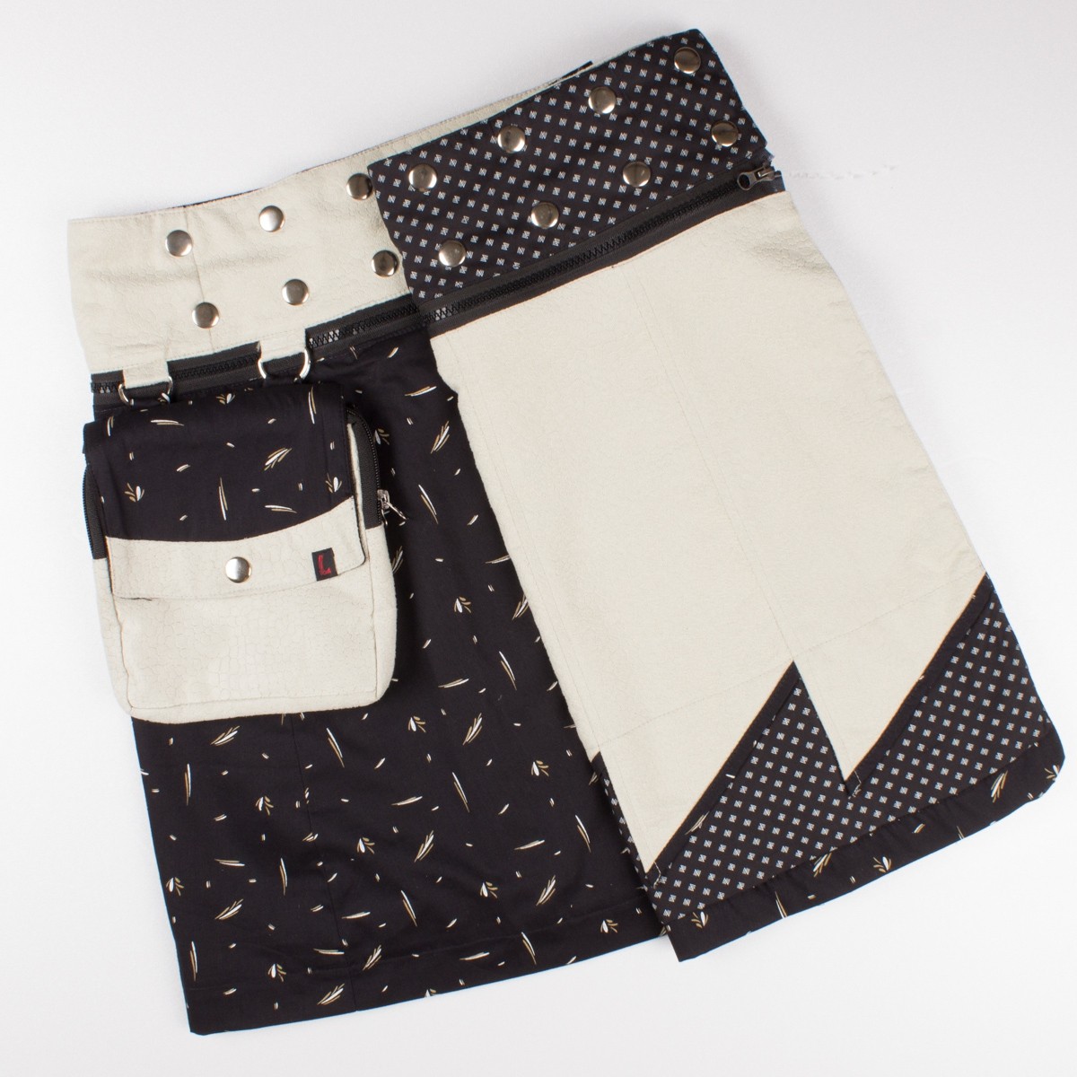 • La pochette est détachable de la jupe et est munie d'un cordon réglable qui vous permettra aussi de la porter seule mais aussi à la ceinture grâce à ses boutons pops