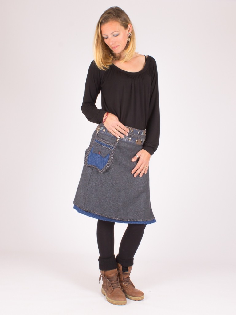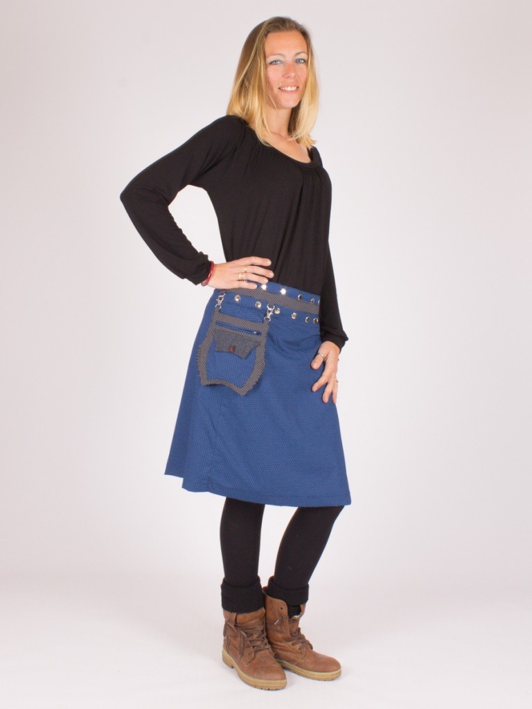 Très originale, chaude avec un côté en tweed. Disponible en 3 longueurs selon les envies. Les boutons pression font qu'elle s'adapte à tous les tours de taille. C'est génial. Et la pochette est trop mignonne.