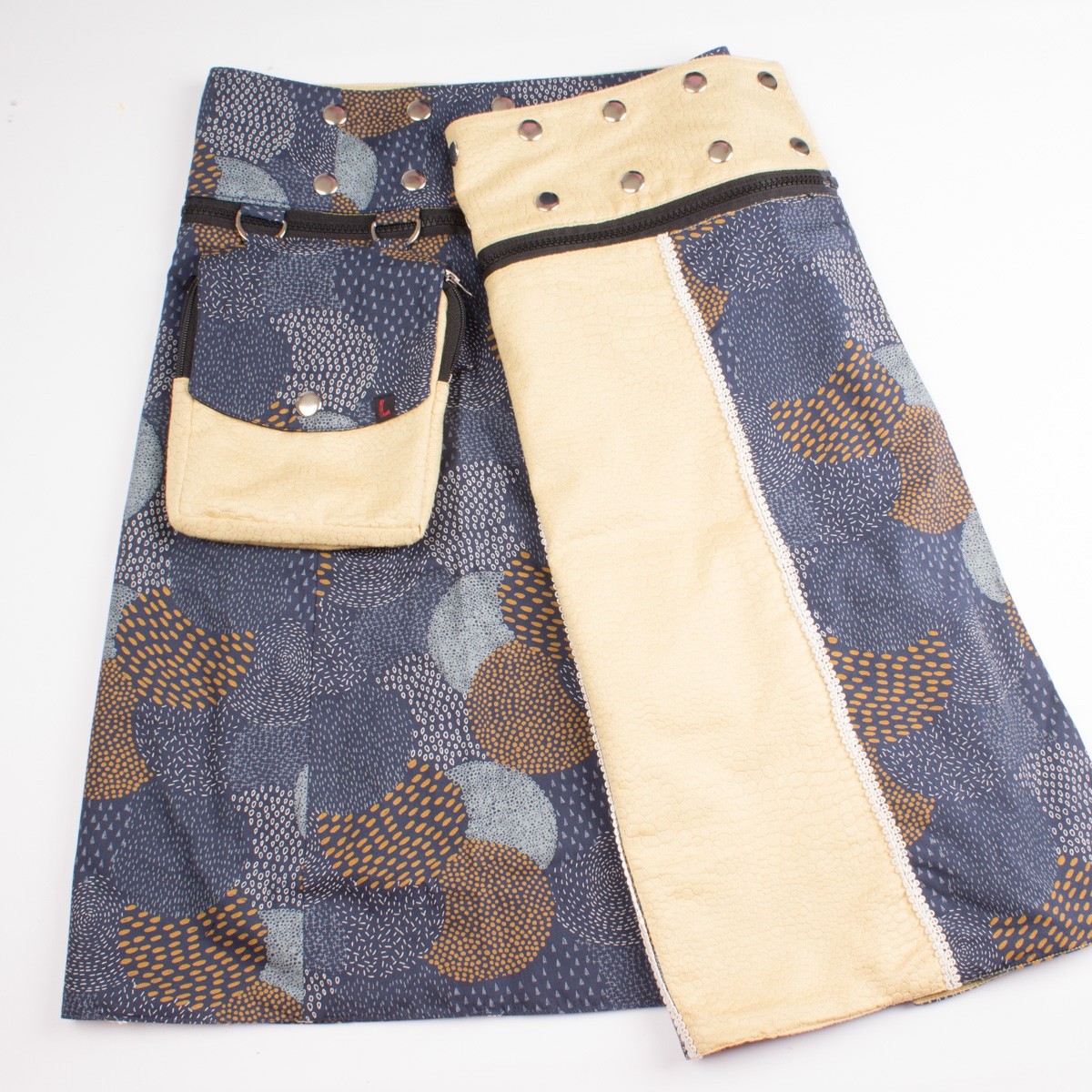 Réversible 4 fois, un zip contenu dans la ceinture permet d'en switcher le sens. Celui du pan de jupe aussi Elle peut être portée seule, en sur-jupe ou mini-jupe avec des collants chauds l'hiver !