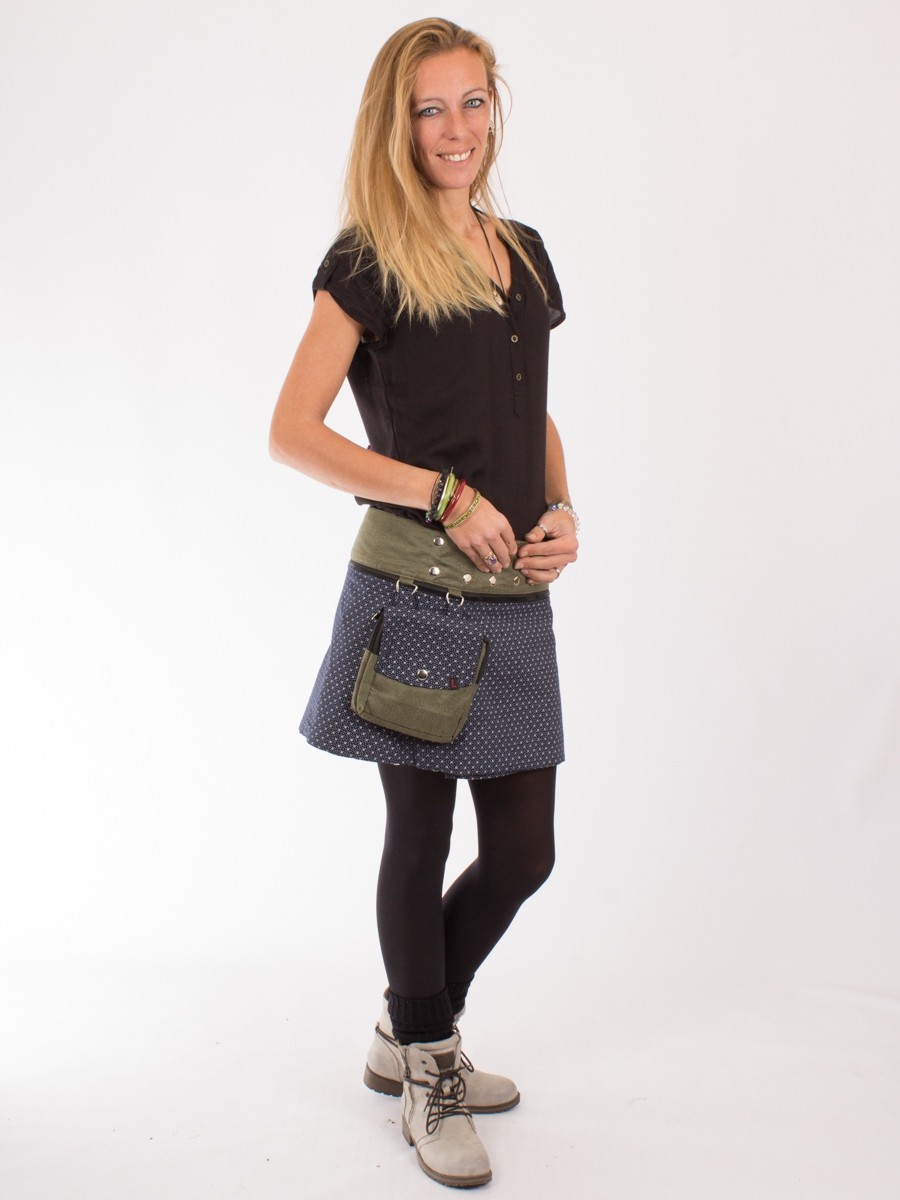• La pochette est détachable de la jupe et est munie d'un cordon réglable qui vous permettra aussi de la porter seule mais aussi à la ceinture grâce à ses boutons pops