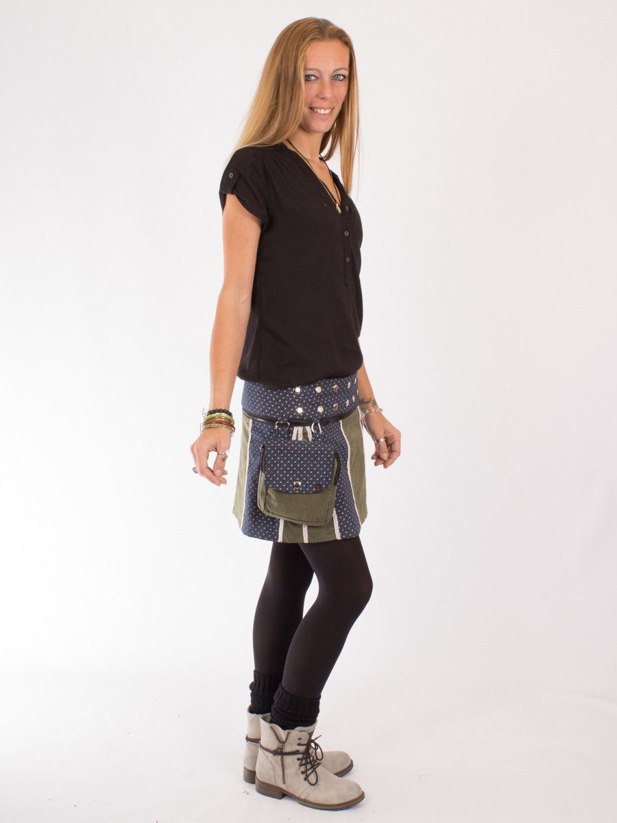 Réversible 4 fois, un zip contenu dans la ceinture permet d'en switcher le sens. Celui du pan de jupe aussi Elle peut être portée seule, en sur-jupe ou mini-jupe avec des collants chauds l'hiver !