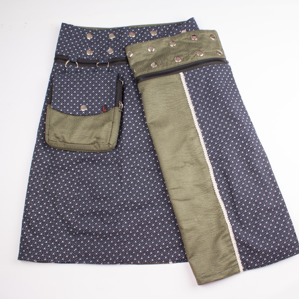Réversible 4 fois, un zip contenu dans la ceinture permet d'en switcher le sens. Celui du pan de jupe aussi Elle peut être portée seule, en sur-jupe ou mini-jupe avec des collants chauds l'hiver !