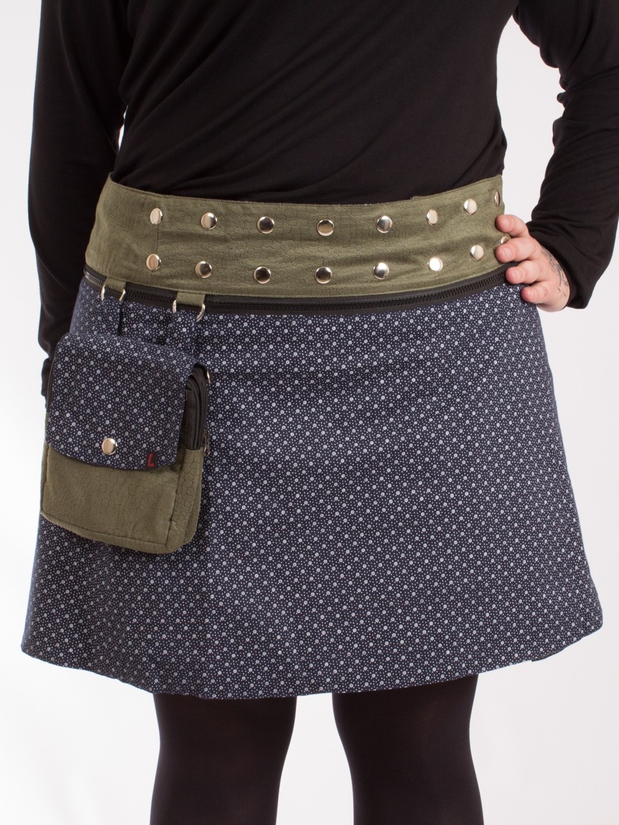 • La pochette est détachable de la jupe et est munie d'un cordon réglable qui vous permettra aussi de la porter seule mais aussi à la ceinture grâce à ses boutons pops