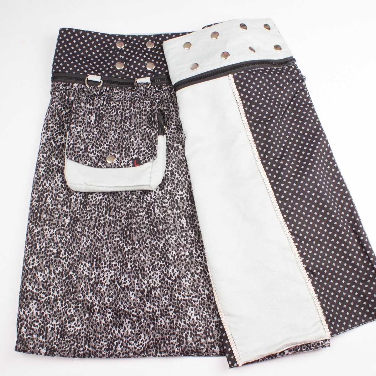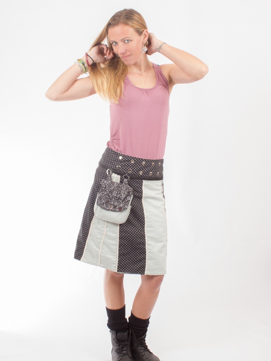 • La pochette est détachable de la jupe et est munie d'un cordon réglable qui vous permettra aussi de la porter seule mais aussi à la ceinture grâce à ses boutons pops