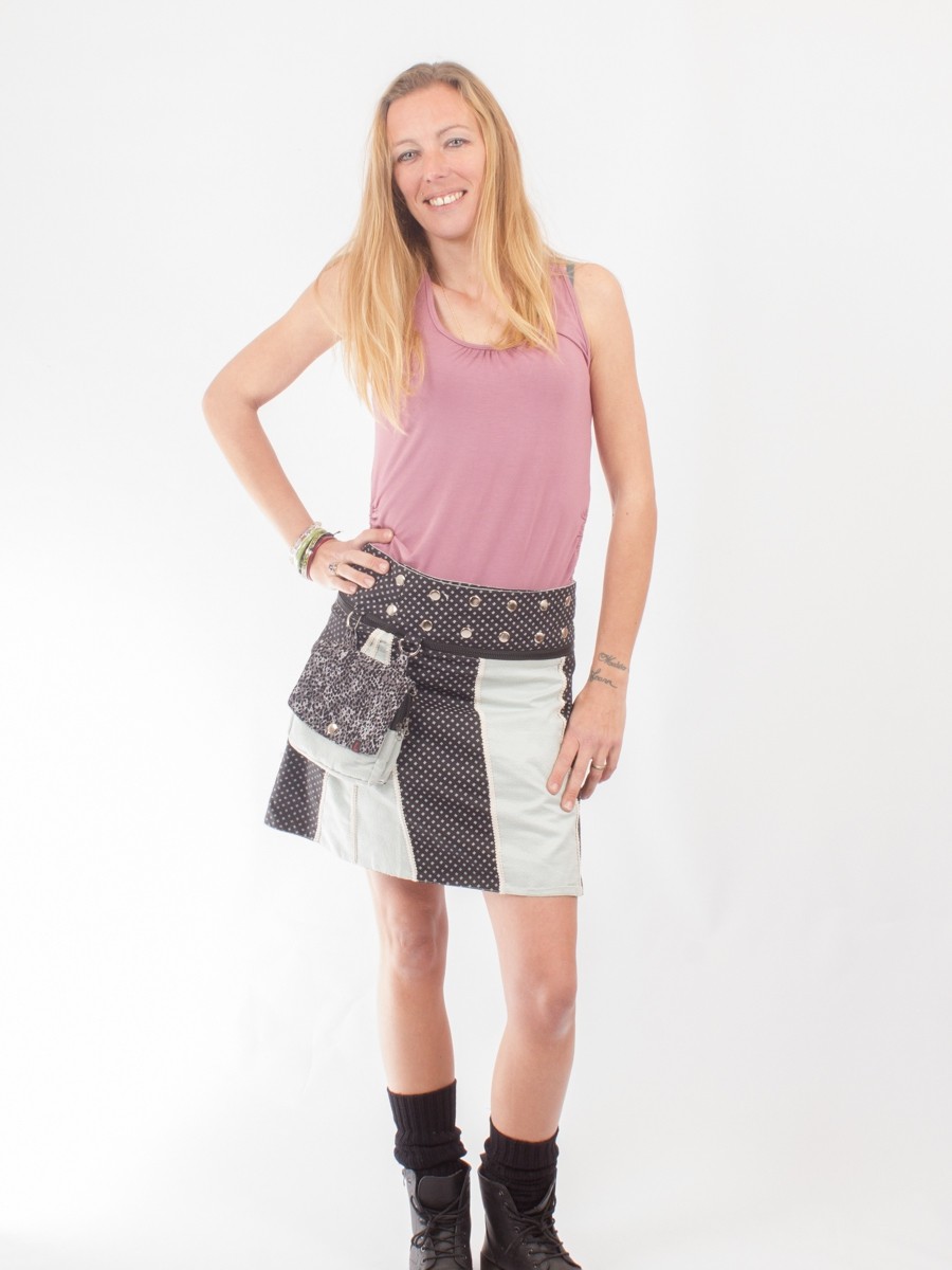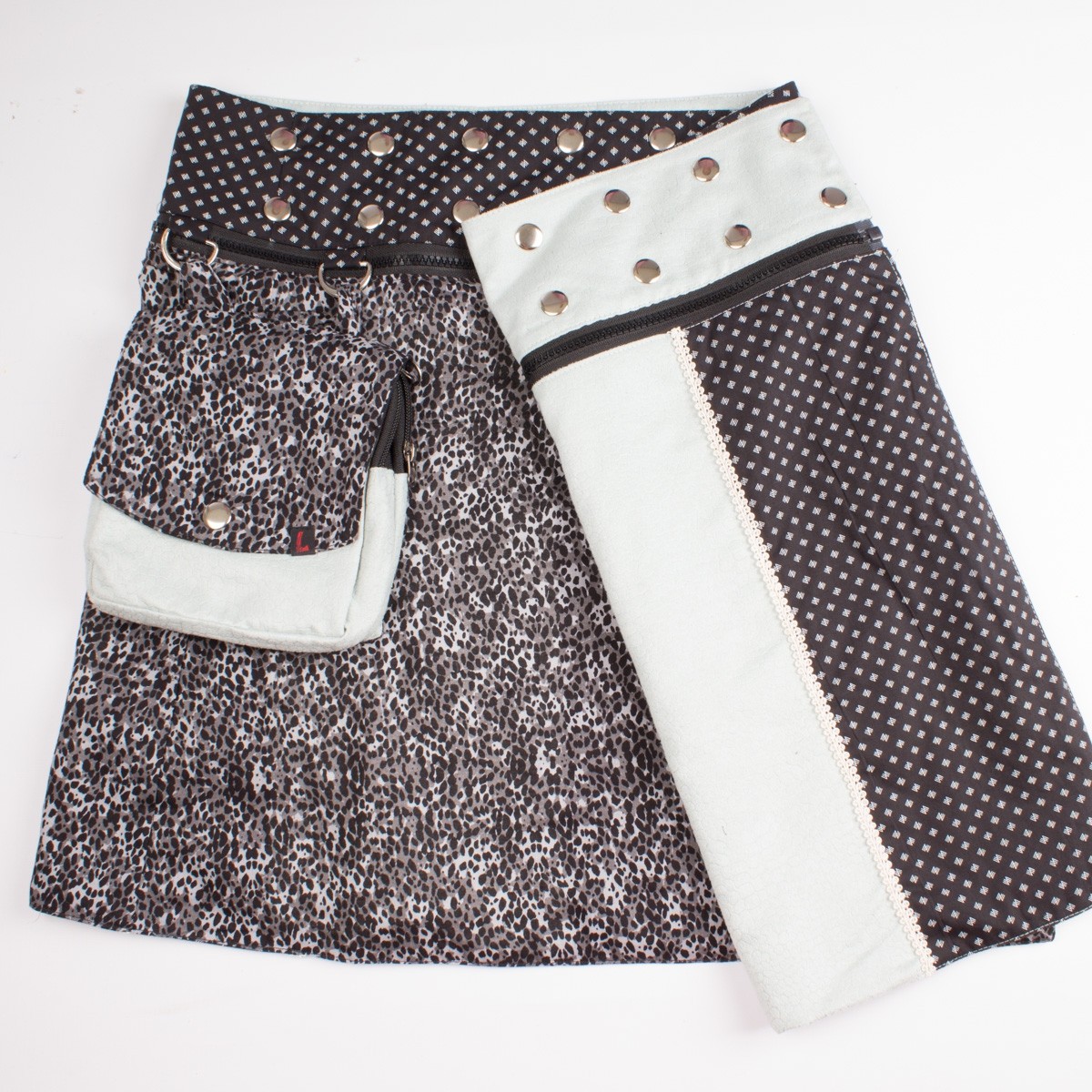 • La pochette est détachable de la jupe et est munie d'un cordon réglable qui vous permettra aussi de la porter seule mais aussi à la ceinture grâce à ses boutons pops