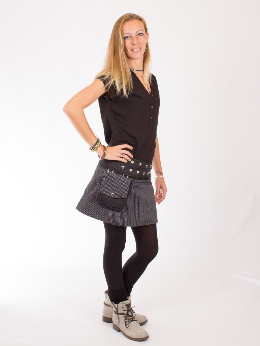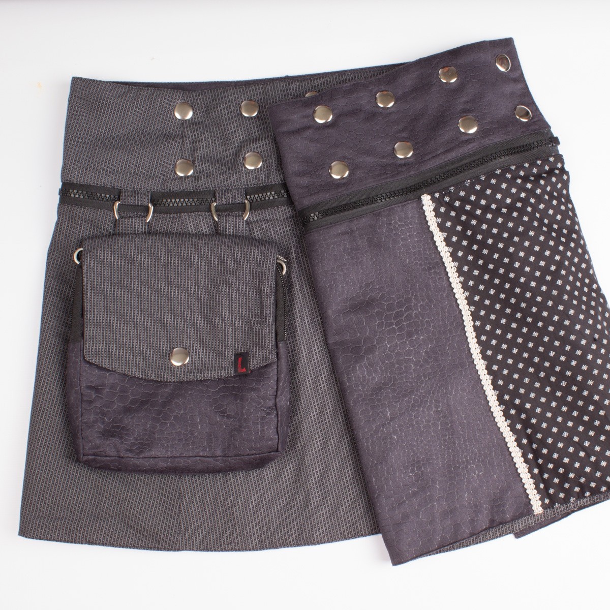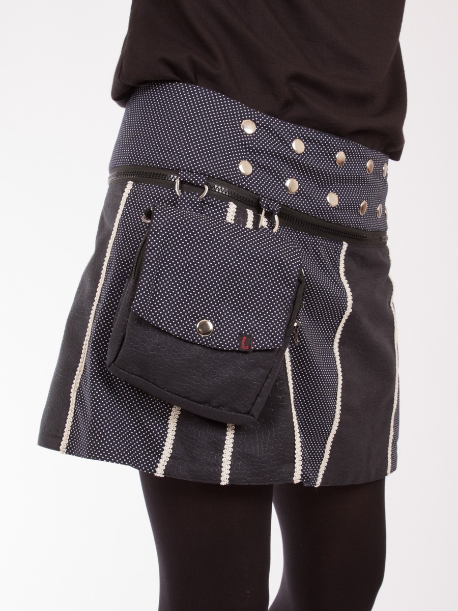 • La pochette est détachable de la jupe et est munie d'un cordon réglable qui vous permettra aussi de la porter seule mais aussi à la ceinture grâce à ses boutons pops