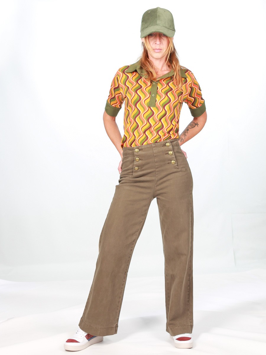 Ce pantalon à pont Victorine, inspiré des pantalons à pont de la marine nationale a été totalement relooké. Par sa coupe élancée, sa taille haute, ses deux rangées de boutons dorés. Il offre une allure chic et élégante. Une pièce essentielle du dressing. Notre conseil style: portez le avec un top court, chemise pincée à la taille afin de mettre en valeur le haut du pantalon