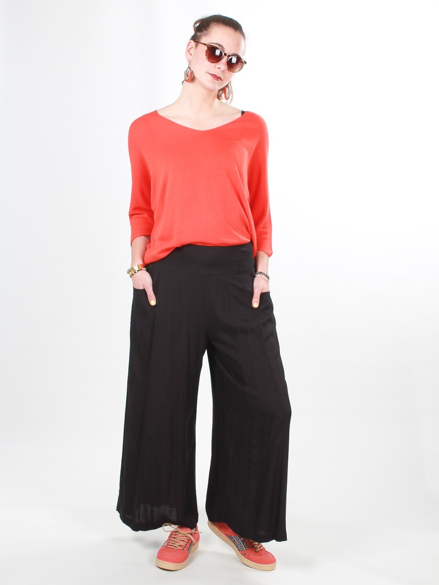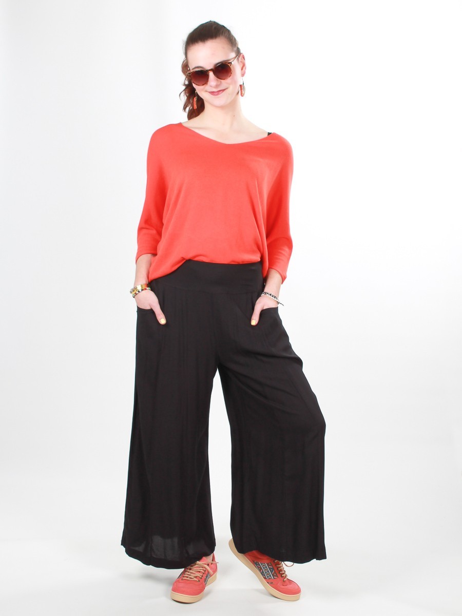 Le style seventies s'invite vraiment avec le pantalon jambes larges EVA. Ce pantalon a une coupe ample, sa taille est marquée par un smok au dos de la ceinture permettant d'adapter ce pantalon pour diverses morphologies. Les couleurs proposées et le tombé lui confère un look bohème que l'on affectionne tant. Combien de looks superbes avez-vous déjà imaginé avec le pantalon EVA ?