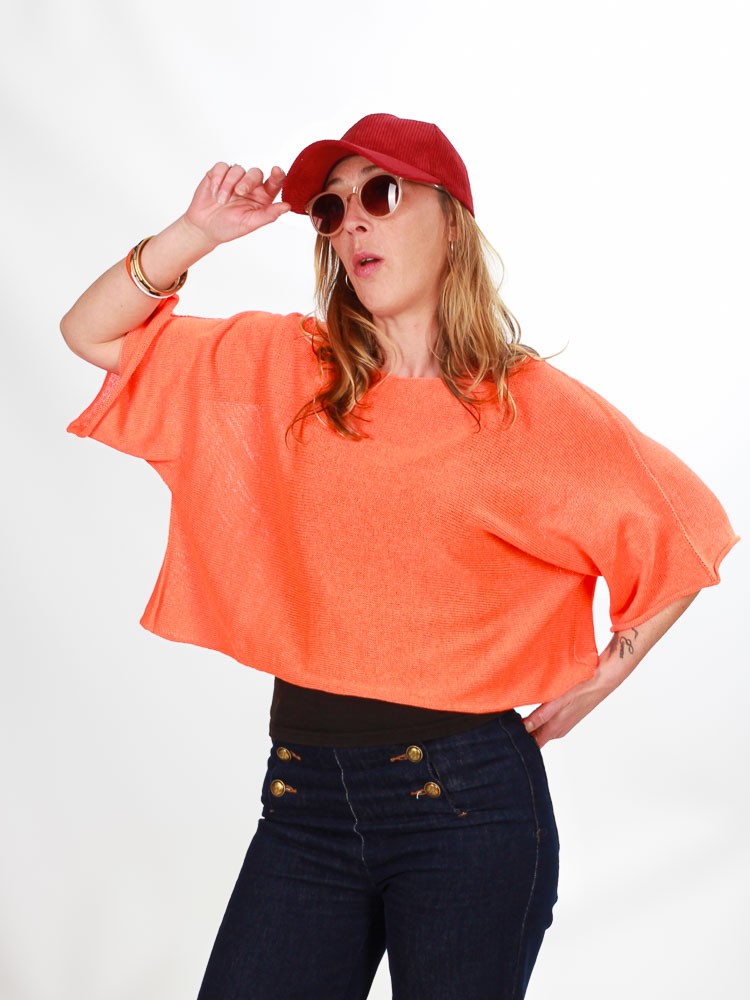 Sa large encolure ronde et sa coupe courte lui confèrent une silhouette contemporaine et féminine, idéale à associer avec un pantalon taille haute ou une jupe fluide.