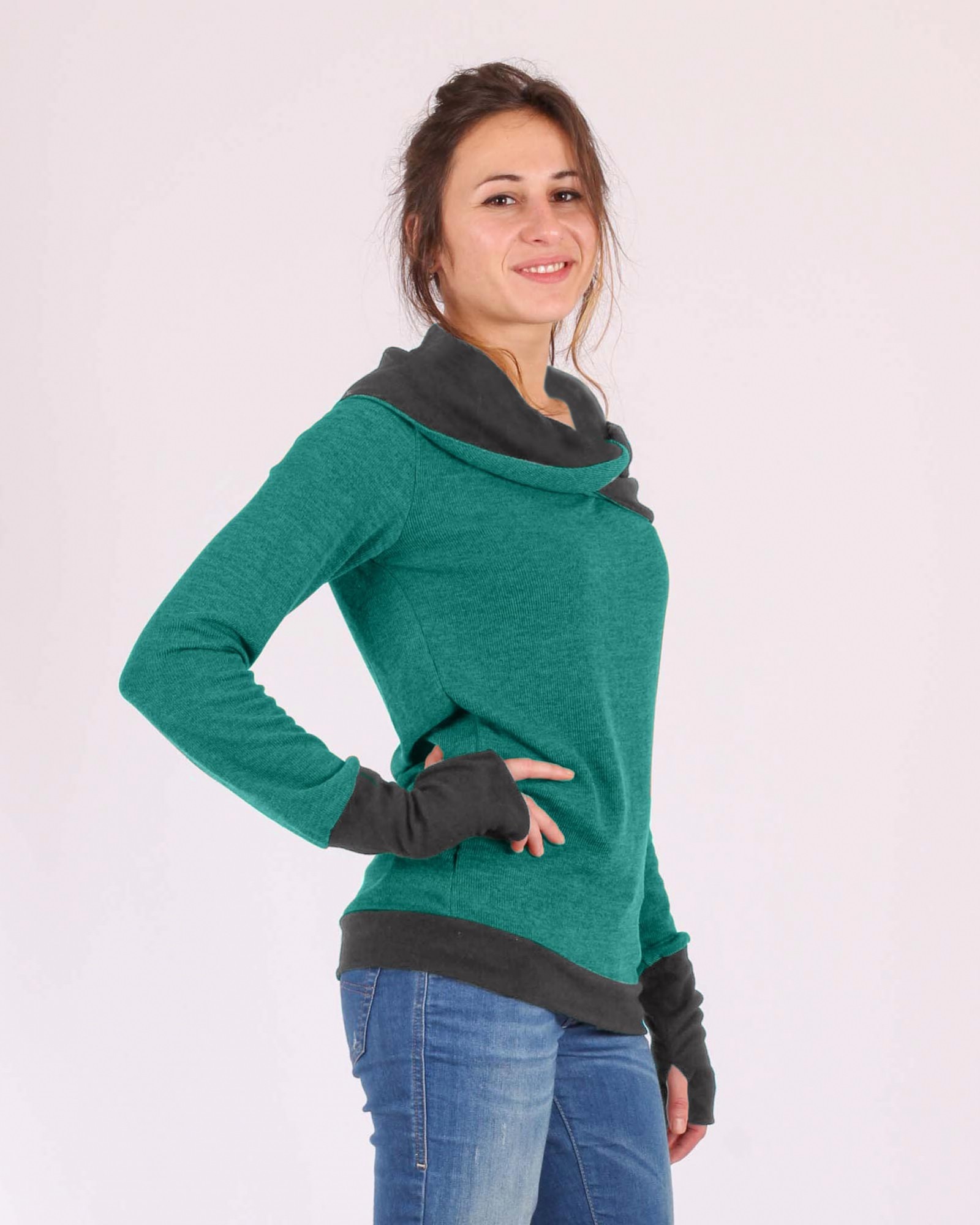Belle découvertesuperbe coloris, forme originalej'adore les manches mitaines en taille XL, les poignets ne sont pas resserrés mais l'effet est là