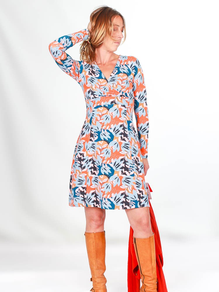 Élégante et féminine, la robe Anoushka en coton biologique séduit par son col cache-cœur froncé, sa ceinture flatteuse et sa jupe évasée. Douce, extensible et confortable, elle allie modernité et romantisme au quotidien.