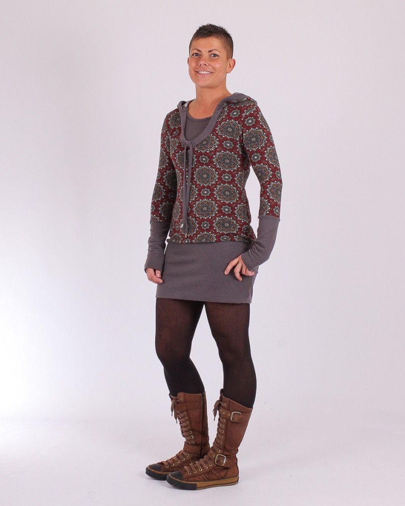 À porter près du corps, large bande unie dans le bas et sur les manches. Capuche à liens pour froncer le col