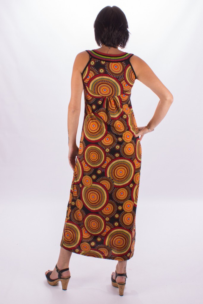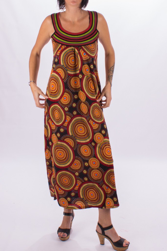 Robe longue, col rond à larges bandes colorées, épaules légèrement dégagées.