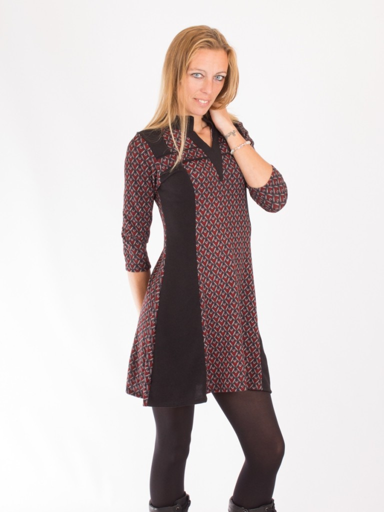 • Une forme trapèze, des manches 3/4 et 2 bandes unies de chaque côté à l'avant pour le côté rétro .