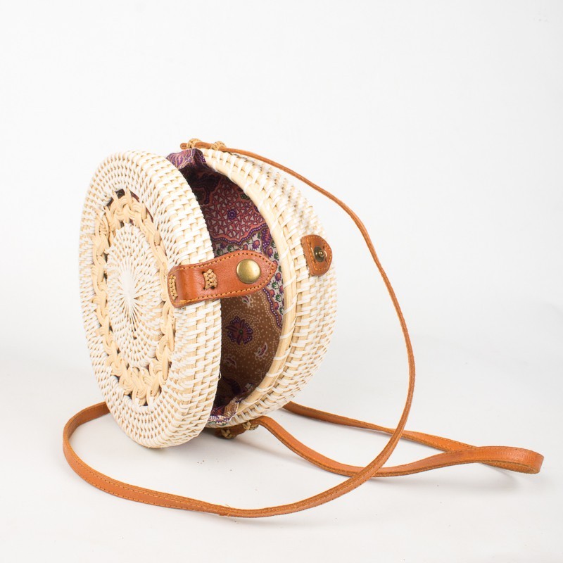 De forme ronde, il est doublé à l'intérieur d'un tissu de coton imprimé cachemire Batik traditionnel, lanière en cuir véritable..