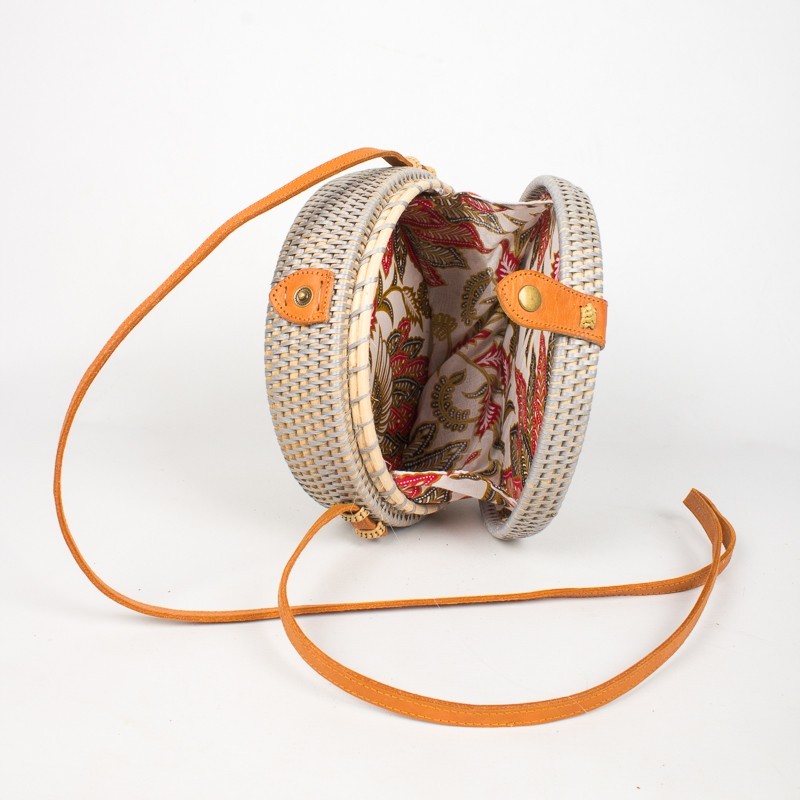 De forme ronde, il est doublé à l'intérieur d'un tissu de coton imprimé cachemire Batik traditionnel, lanière en cuir véritable..