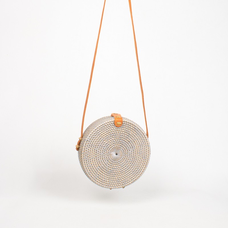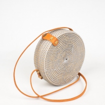 Sac en rotin tressé rond bicolore crème et argent style bohème