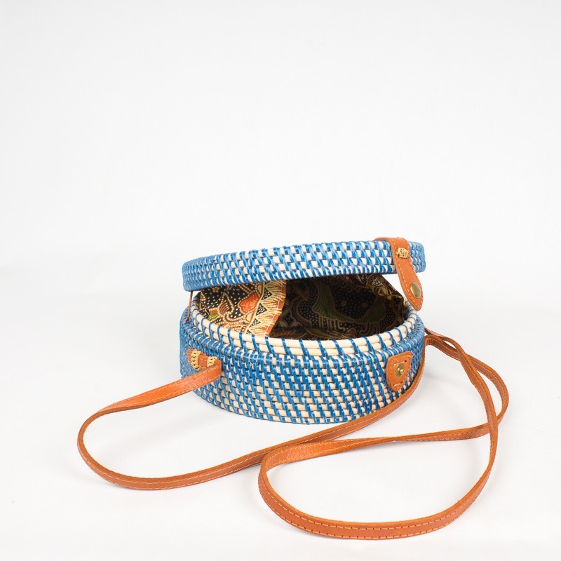 De forme ronde, il est doublé à l'intérieur d'un tissu de coton imprimé cachemire Batik traditionnel, lanière en cuir véritable..