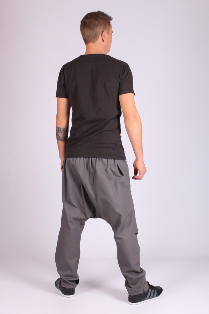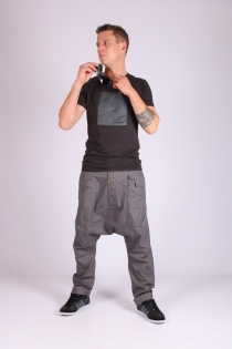 Sarouel à entrejambe basse (50 cm), 2 poches et boutons à l'avant, ceinture élastiquée à l'arrière. Coutures apparentes.