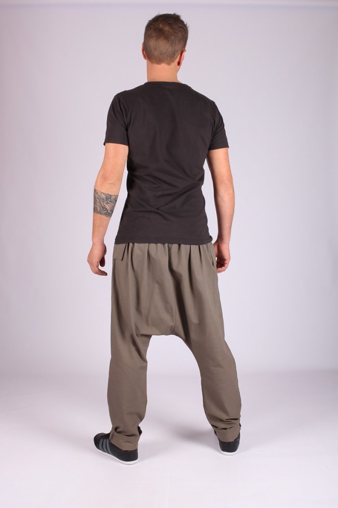 Sarouel à entrejambe basse (50 cm), 2 poches et boutons à l'avant, ceinture élastiquée à l'arrière. Coutures apparentes.