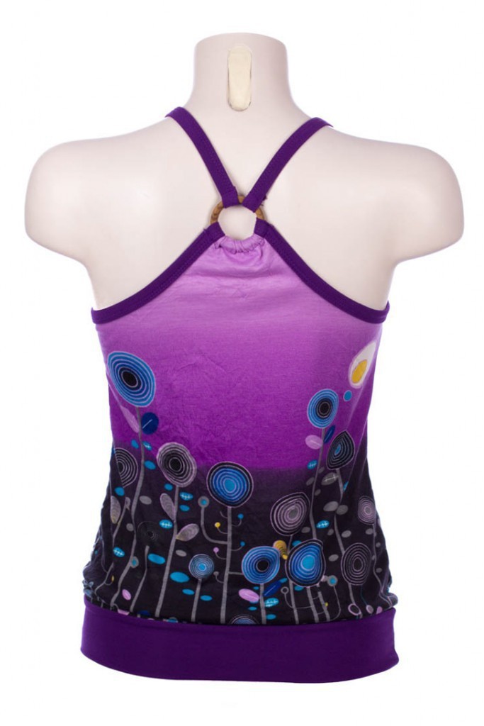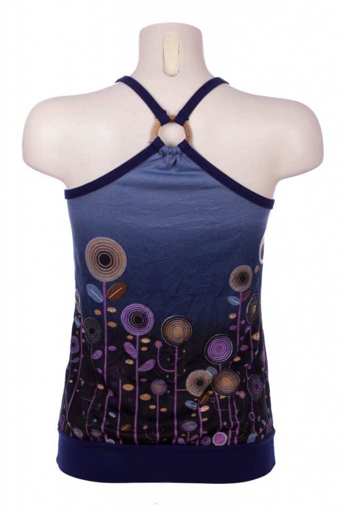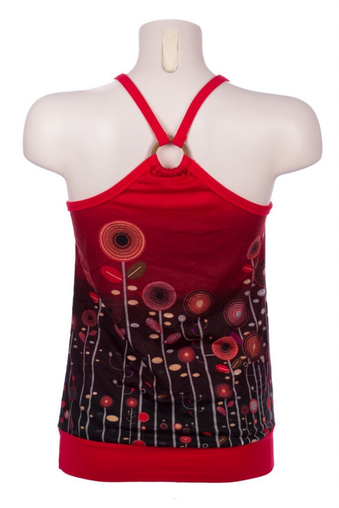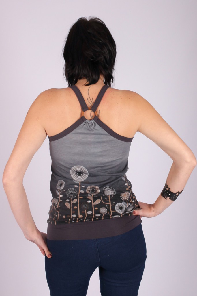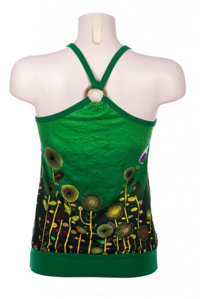 Top à encolure arrondie et fines bretelles. Les épaules sont dégagées et les bretelles dans le dos sont reliées par un rond en bois de coco. Bande élasthanne à la taille
