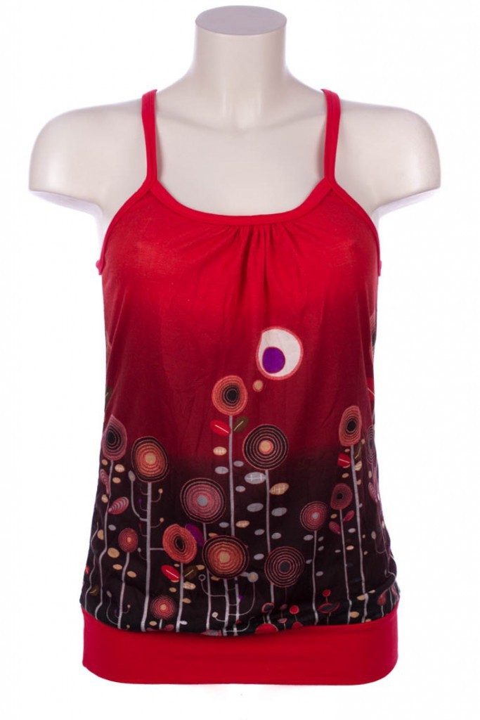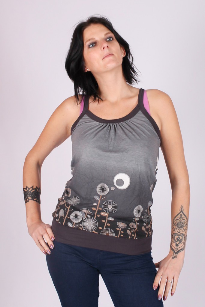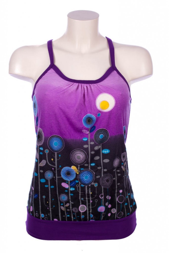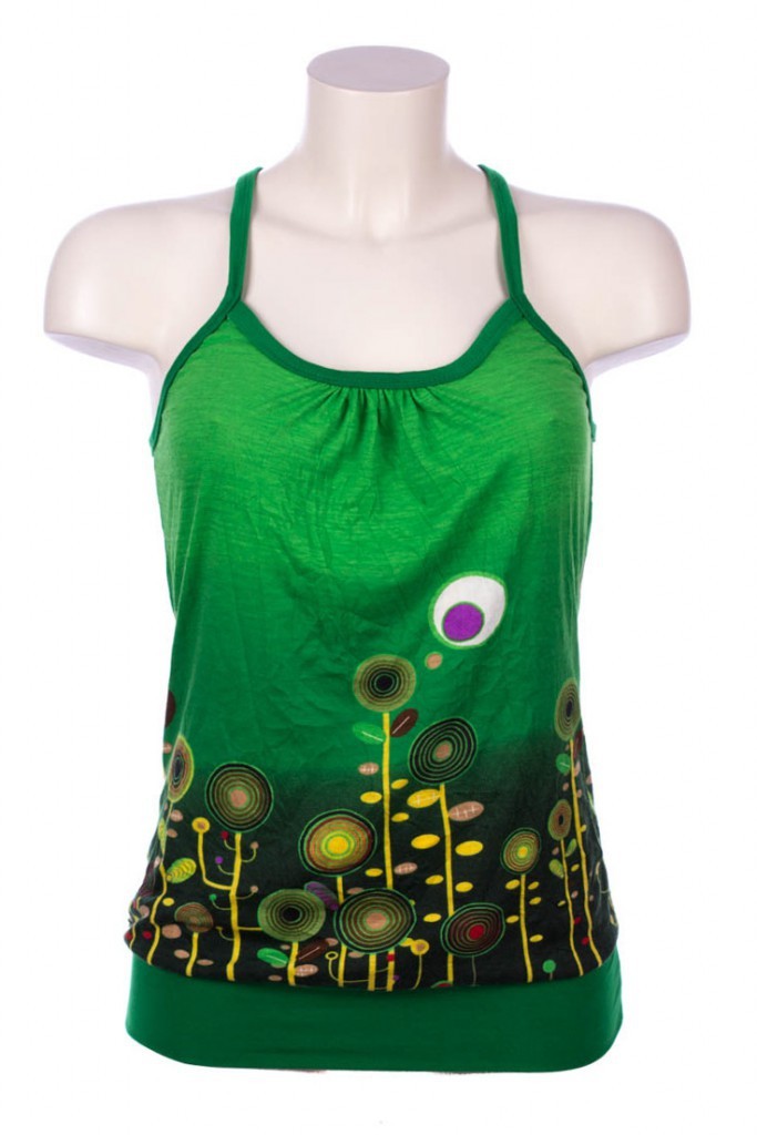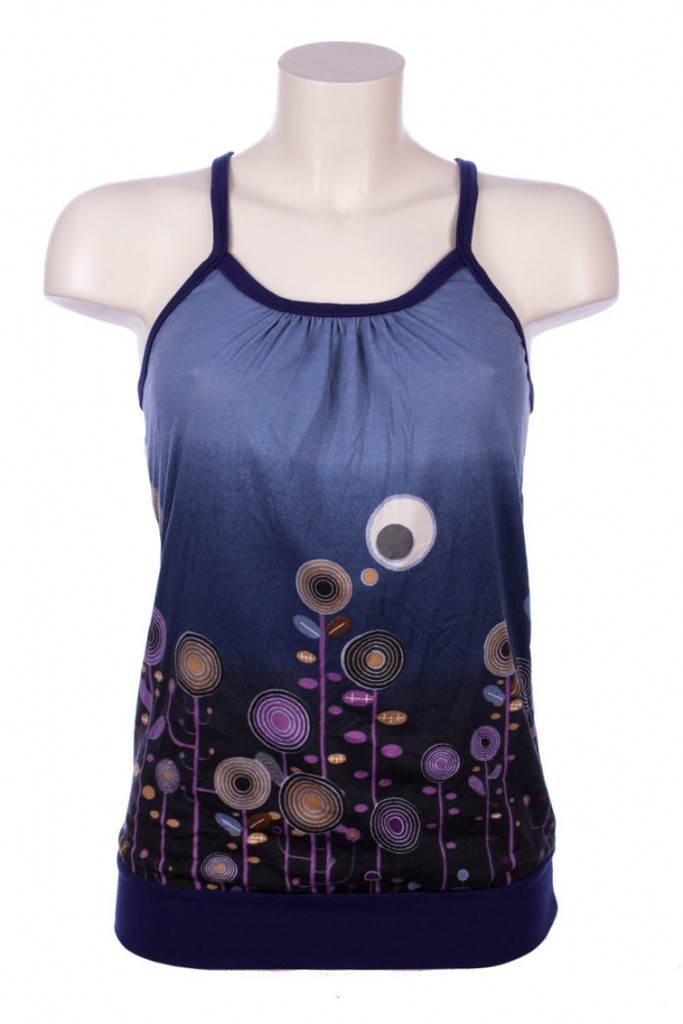 Top à encolure arrondie et fines bretelles. Les épaules sont dégagées et les bretelles dans le dos sont reliées par un rond en bois de coco. Bande élasthanne à la taille