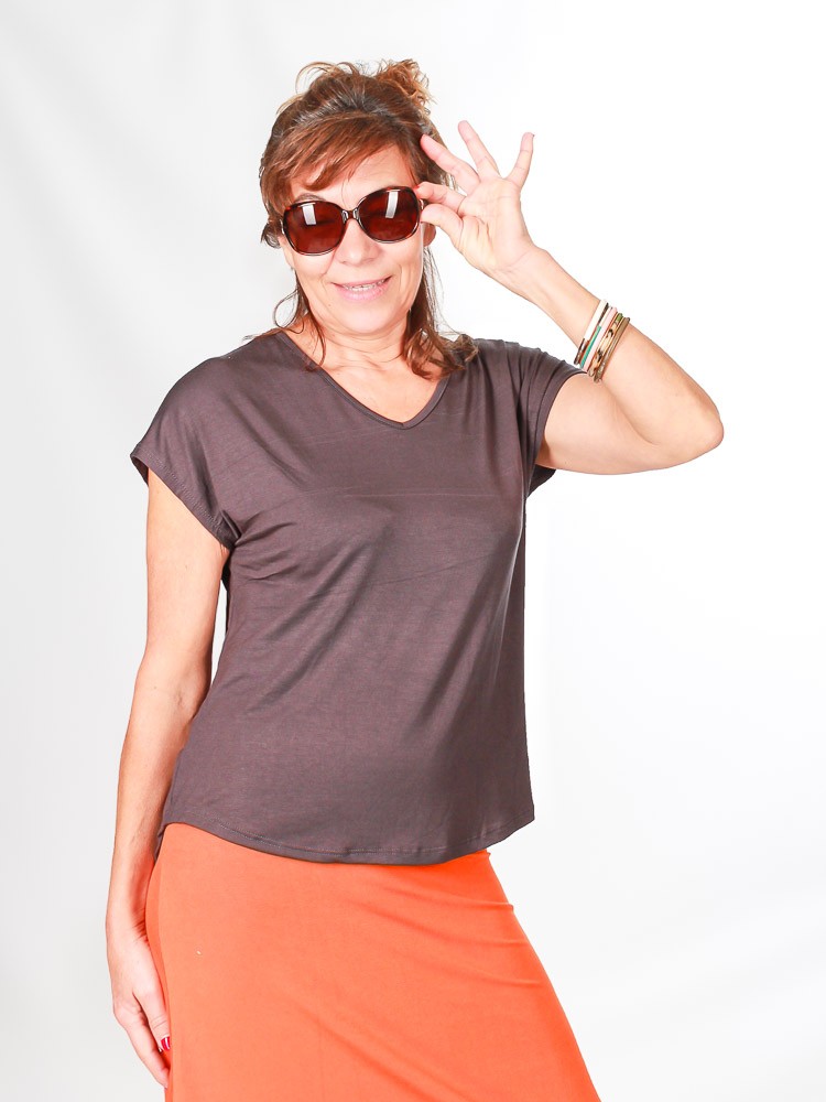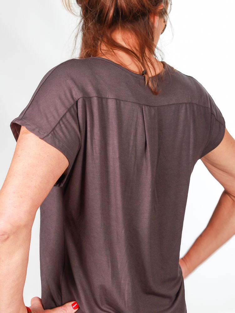 Top fluide à col V avec manches à ailettes et épaules tombantes. Coupe légèrement plus longue à l'arrière avec bas arrondi, empiècement au dos et plis d'aisance. Silhouette oversize, disponible en 3 tailles.