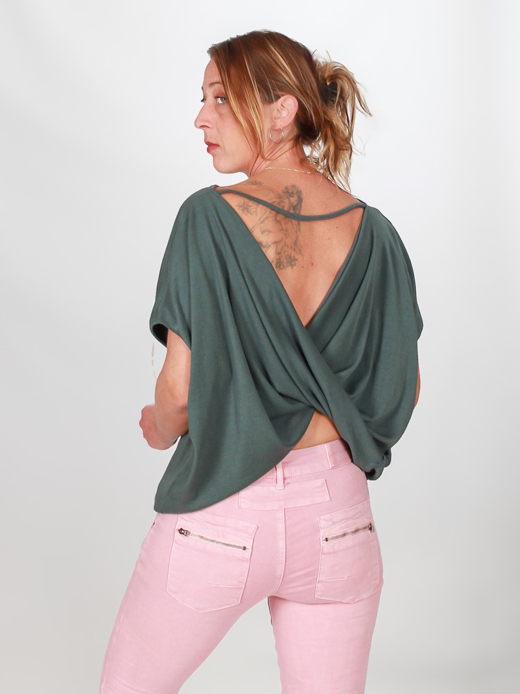Avec son allure décontractée inspirée du t-shirt, il se distingue par son dos croisé drapé, dévoilant subtilement le bas du dos pour une touche chic et glamour.