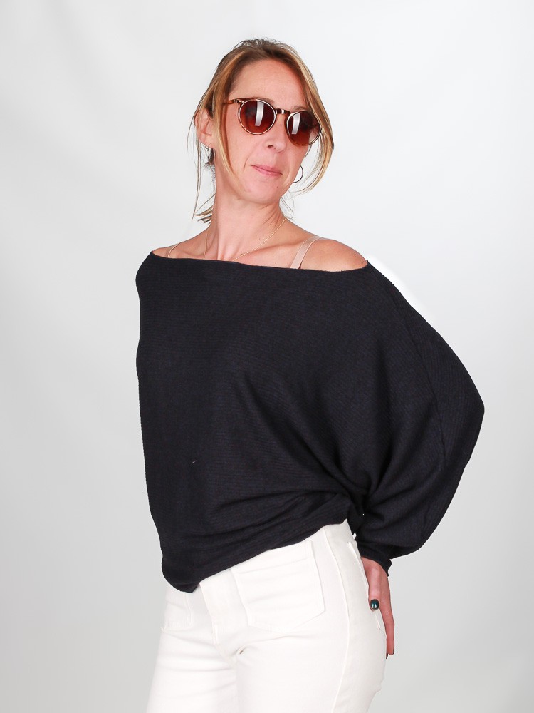 Sa coupe fluide et ample met en valeur la silhouette avec élégance, tandis que ses manches chauve-souris offrent un confort absolu.