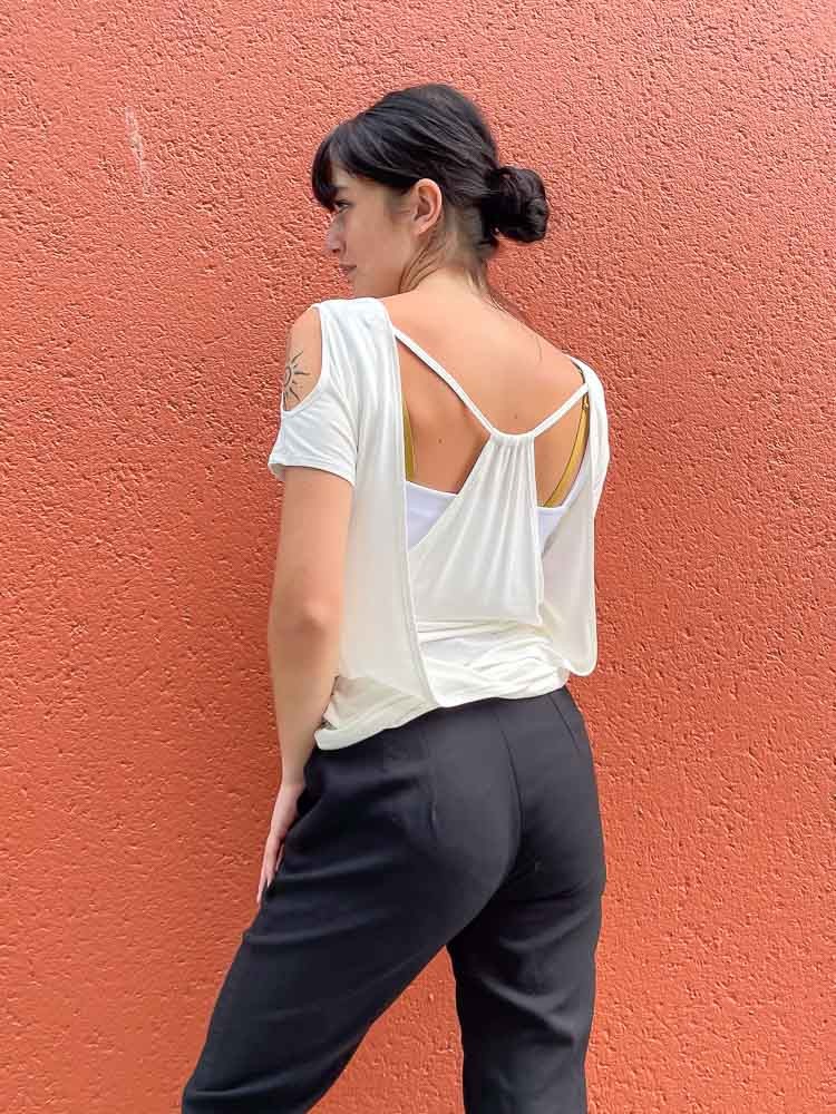 Top débardeur glamour à dos croisé et col bénitier. Épaules dénudées avec empiècements découpés, encolure ronde. Liens au dos pour une touche sensuelle. Parfait de jour comme de nuit. Disponible en 3 tailles.
