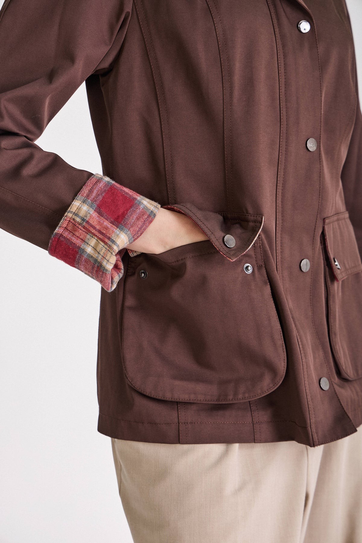 Une allure outdoor chic et intemporelle. Cette veste en coton ciré déperlant marie fonctionnalité et élégance, avec ses grandes poches plaquées et son col classique. Les revers à carreaux retroussables apportent une touche british subtile, signature du style Lilalilou.